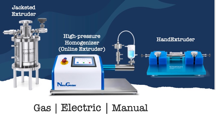 The jacketed liposome extruders allow for gas power. An electric option is available if you go for a high-pressure homogenizer with or without an extruder. And manual options are available in the HandExtruder and HandGenizer.