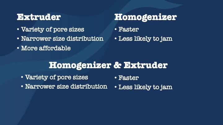 First, what pore size do you need? While a solo homogenizer reaches a liposome size of 20-30nm, any option with extrusion allows for more choice.
